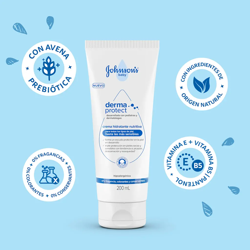 El humectante nutritivo Derma Protect de Johnson’s Baby forma un escudo protector sobre la piel en desarrollo con triple cuidado para la irritación, sequedad y alergias. La fórmula no grasa se absorbe rápidamente y es fácil de esparcir, lo que hace más fácil tu rutina con tu bebé. Y cuenta con: avena prebiótica que fortalece la microbiota saludable de la piel; vitamina E que ayuda en la nutrición y desarrollo de la piel del bebé y vitamina B5 (Pantenol), que ayuda a calmar y fortalecer la barrera cutánea.
