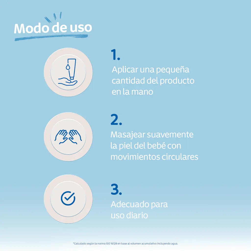 Coloca una pequeña cantidad de producto en tu mano y masajea suavemente la piel de tu bebé con movimientos circulares.