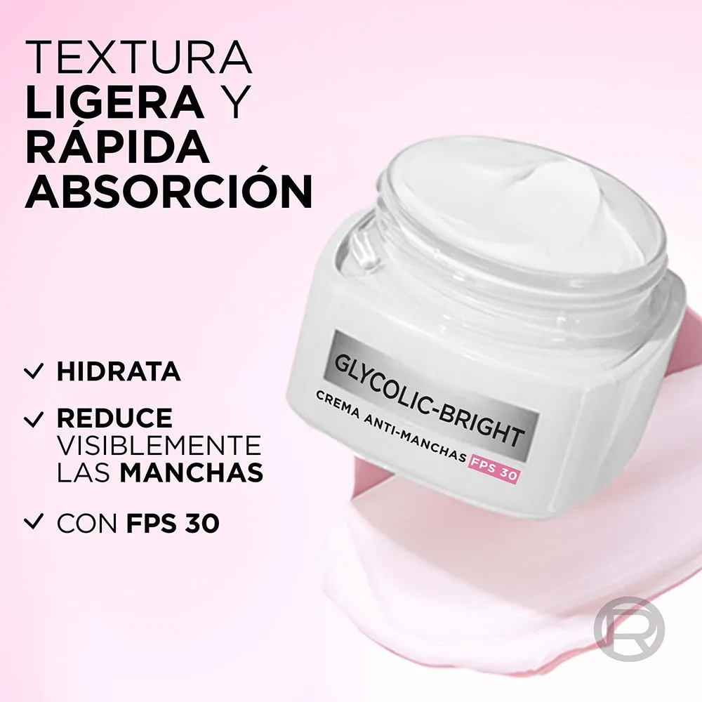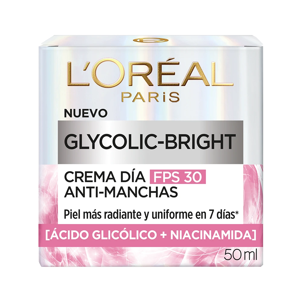 Protegé tu piel y combatí las manchas al mismo tiempo con la Crema de Día L’Oréal Paris Glycolic Bright, formulada con ácido glicólico puro y FPS 30. Esta crema hidratante de textura ligera ayuda a reducir visiblemente las manchas oscuras, unificar el tono de la piel y mejorar la luminosidad natural del rostro.