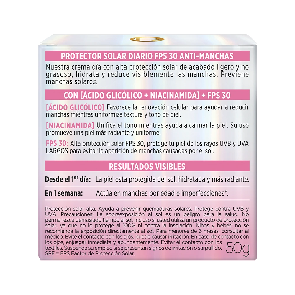 Crema facial de día con ácido glicólico y protección solar FPS 30. Ayuda a reducir manchas y unificar el tono mientras protege del sol.