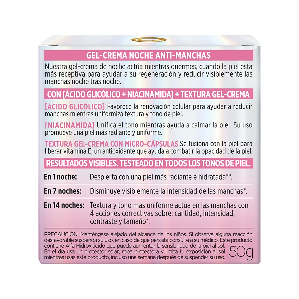 Gel-crema nocturno con ácido glicólico que reduce manchas, renueva la piel y mejora la luminosidad mientras dormís.
