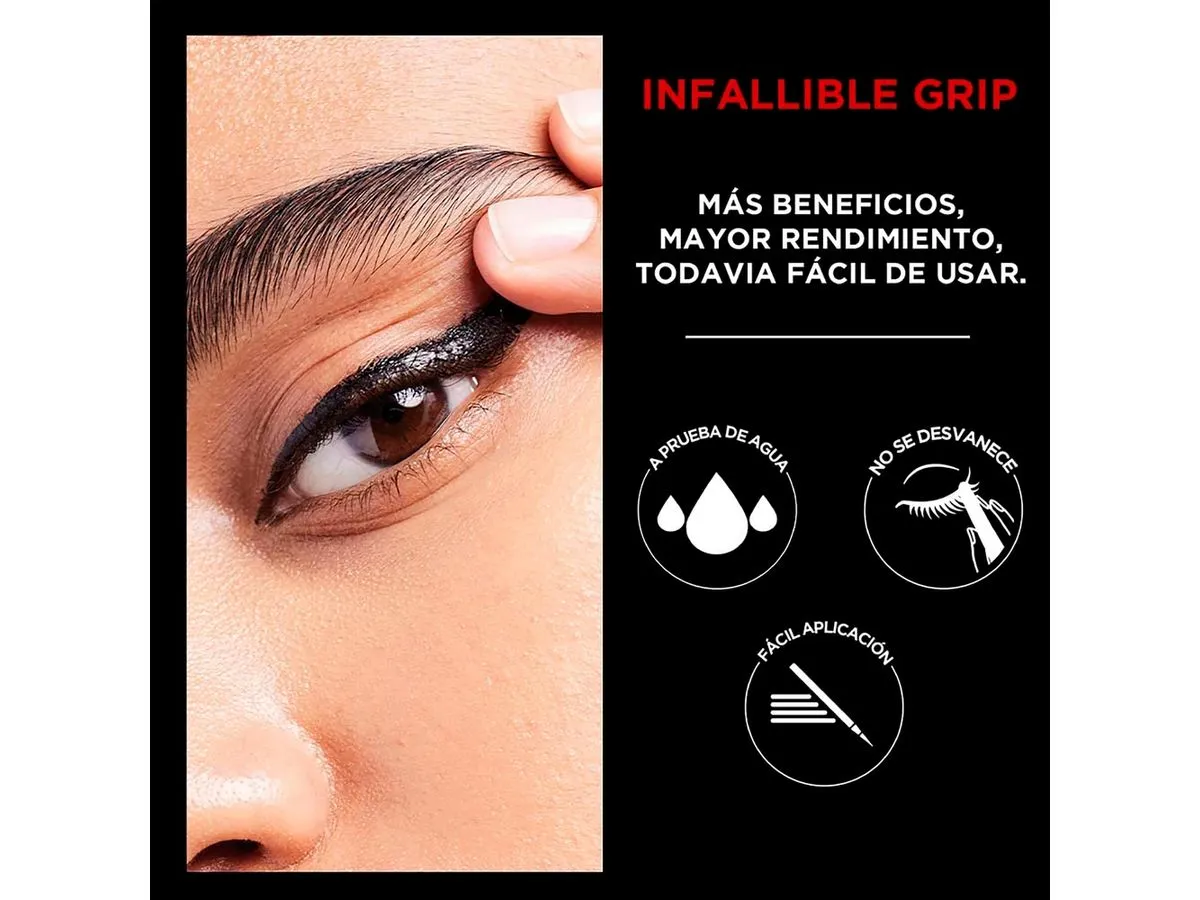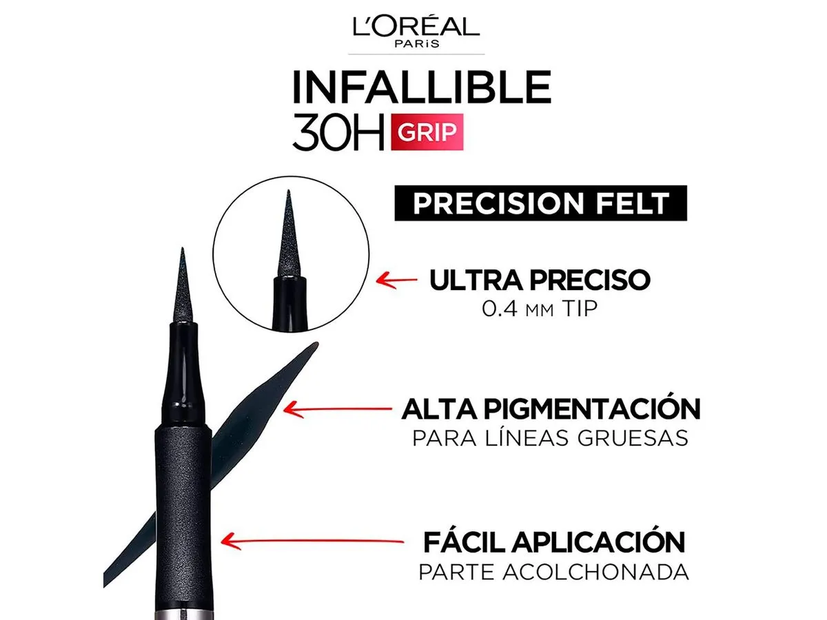 El L’Oréal Infallible Grip Delineador Líquido está diseñado para lograr líneas definidas, intensas y duraderas. Su punta de fieltro ultra precisa permite crear fácilmente desde delineados sutiles hasta cat eyes dramáticos, con un control máximo y sin esfuerzo.