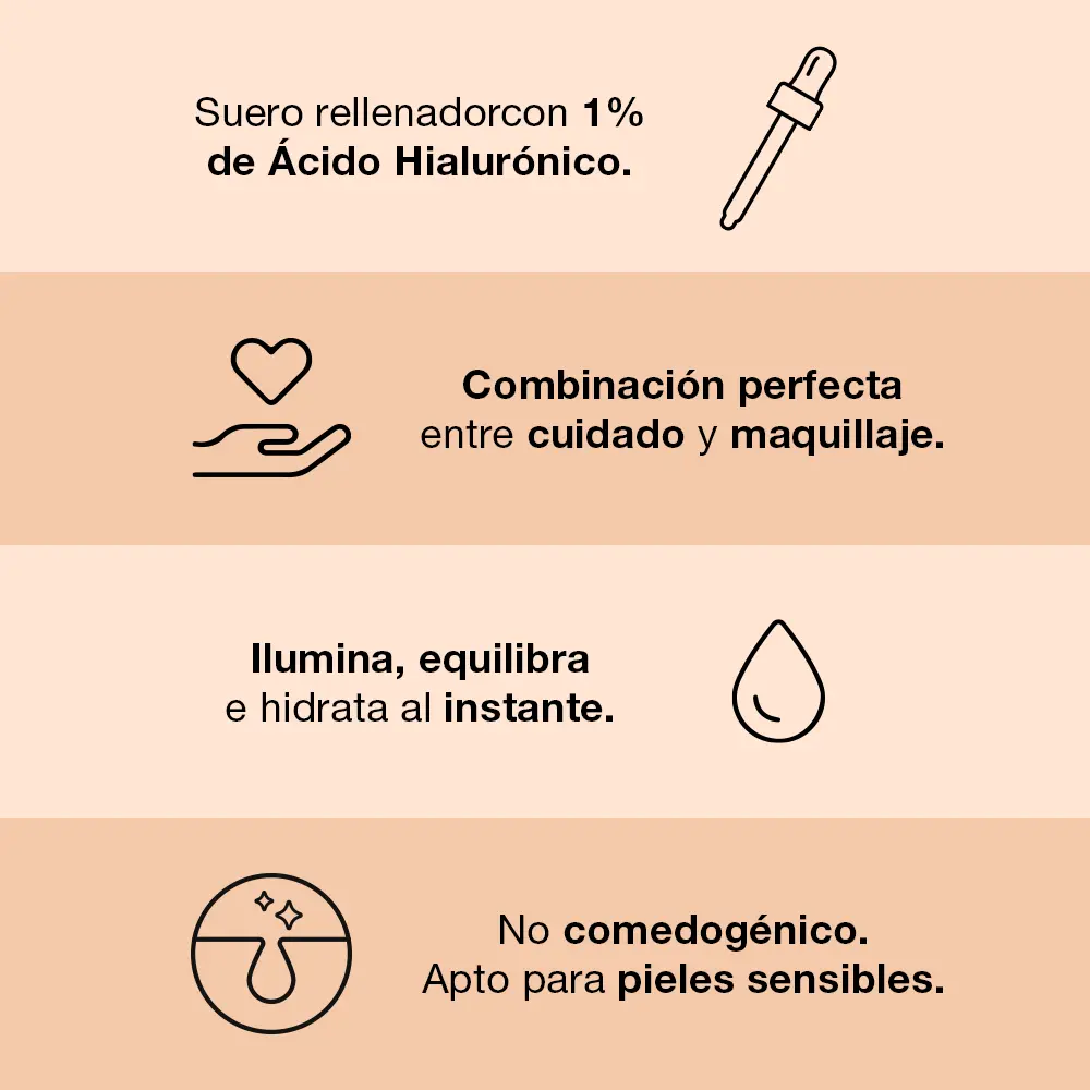 Sérum con color que unifica el tono, hidrata y deja la piel visiblemente más luminosa. Con 1% de ácido hialurónico puro.