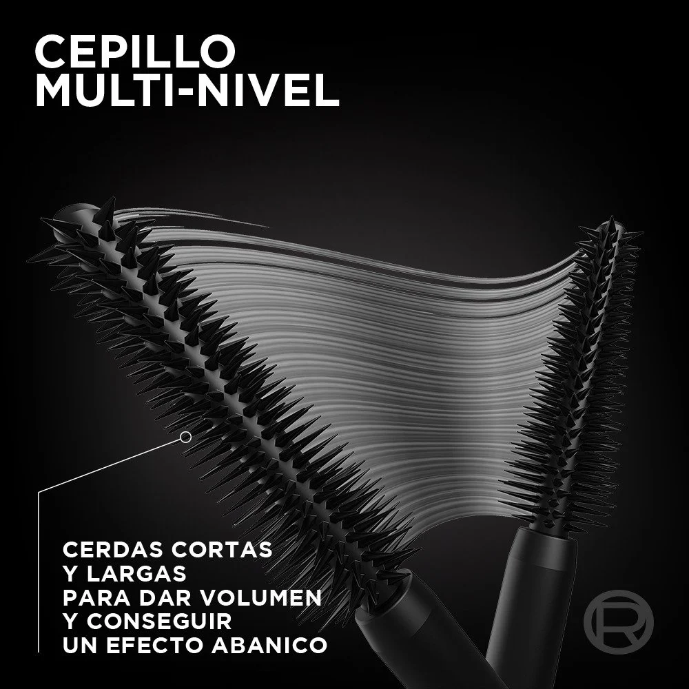 Máscara que abre tu mirada con efecto abanico. Volumen definido, alargamiento extremo y cepillo multi-direccional para pestañas multiplicadas.