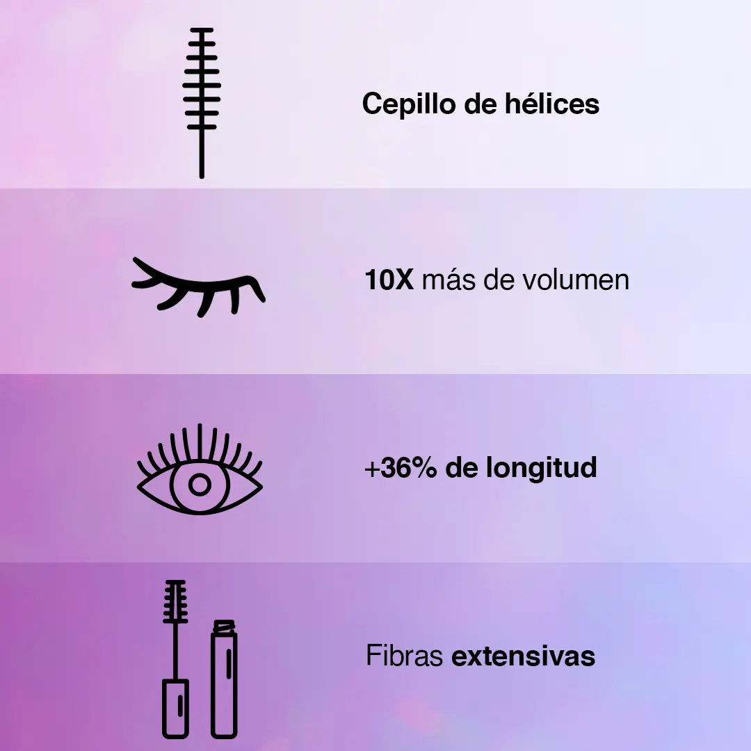 Máscara con fibras híbridas que alarga, curva y da volumen a las pestañas para un look surrealista por hasta 24 horas.
