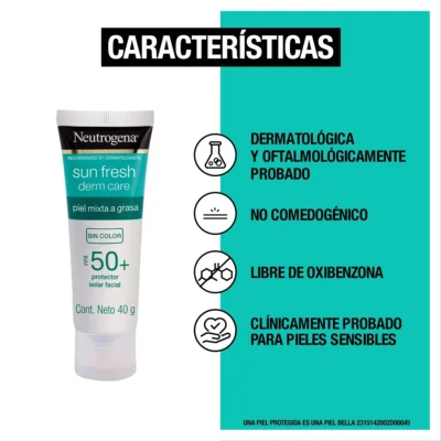 Protección avanzada con acabado mate 🌞. El Neutrogena Sun Fresh Derm Care FPS 70 protege contra los rayos UVA/UVB, controla la grasa y deja la piel suave, fresca y sin brillo.