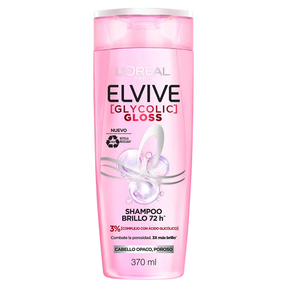 Set con shampoo, acondicionador y tratamiento Elvive Glycolic Gloss. Cabello más brillante, suave y visiblemente saludable desde el primer uso.